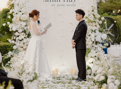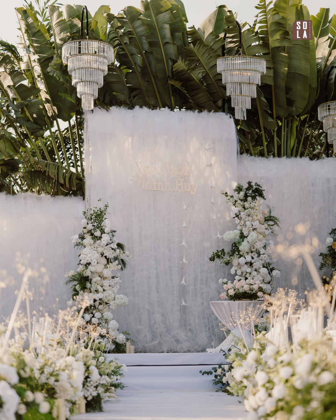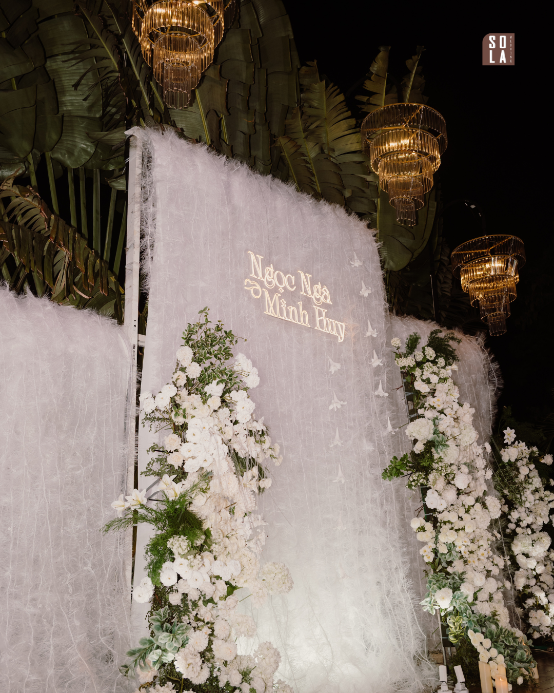Lễ cưới của Ngọc Ngà & Minh Huy được Sola Wedding kiến tạo từ cảm hứng tự nhiên & bền vững, nổi bật với backdrop sử dụng chất liệu sợi cọ sinh học – mềm mại, mộc mạc nhưng vẫn giữ được vẻ thanh lịch sang trọng.