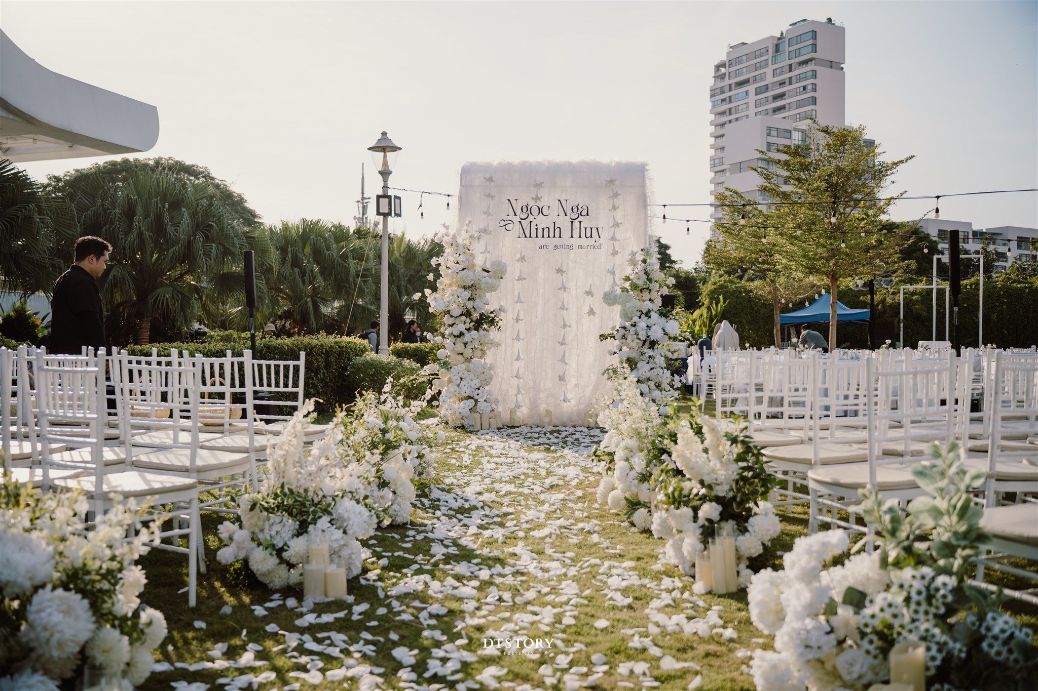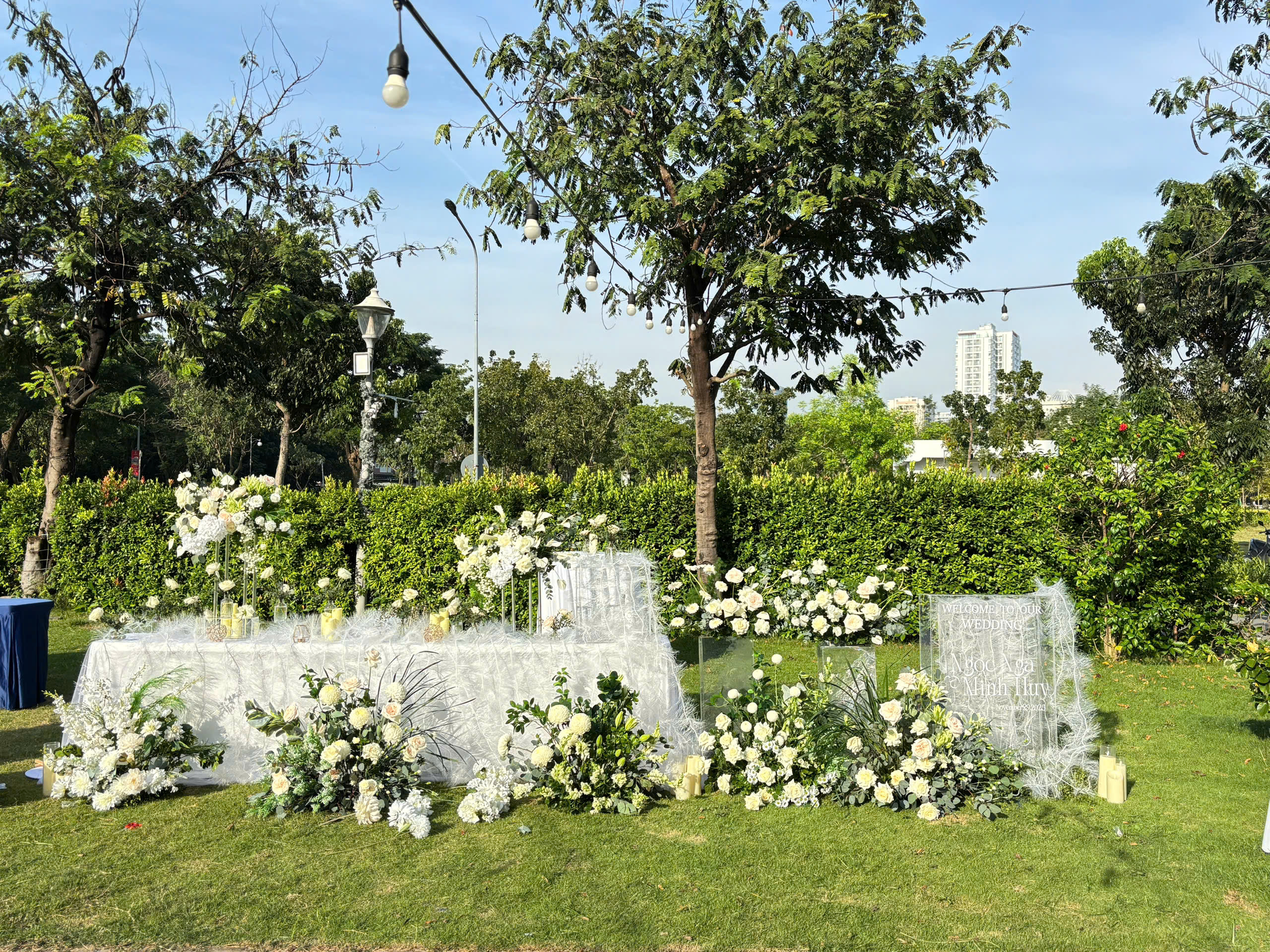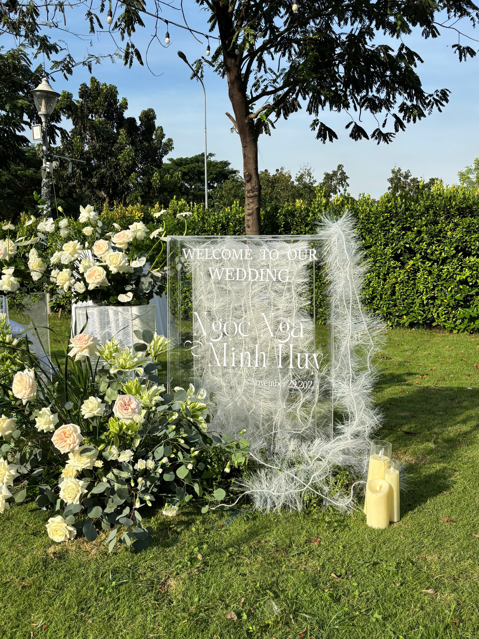 Bề mặt sợi cọ sinh học tạo hiệu ứng rủ nhẹ tự nhiên, kết hợp cùng hoa trắng tinh khôi, sắc xanh lá và ánh nến ấm, mang đến một không gian cưới gần gũi với thiên nhiên, thân thiện môi trường nhưng không kém phần tinh tế. Những chi tiết nhỏ như cánh bướm trang trí, lớp voan nhẹ và ánh sáng hoàng hôn hòa quyện, tạo nên tổng thể nhẹ nhàng, thuần khiết.