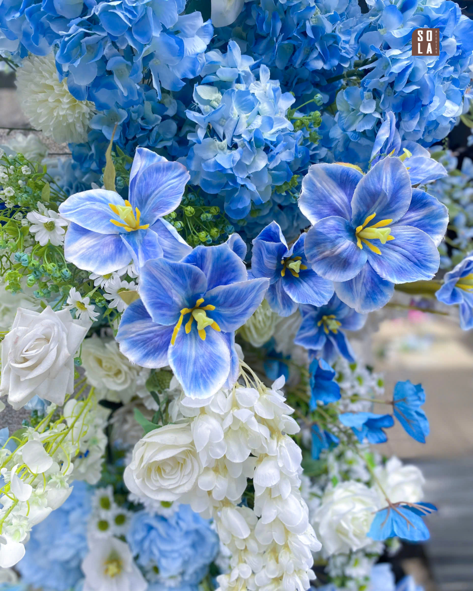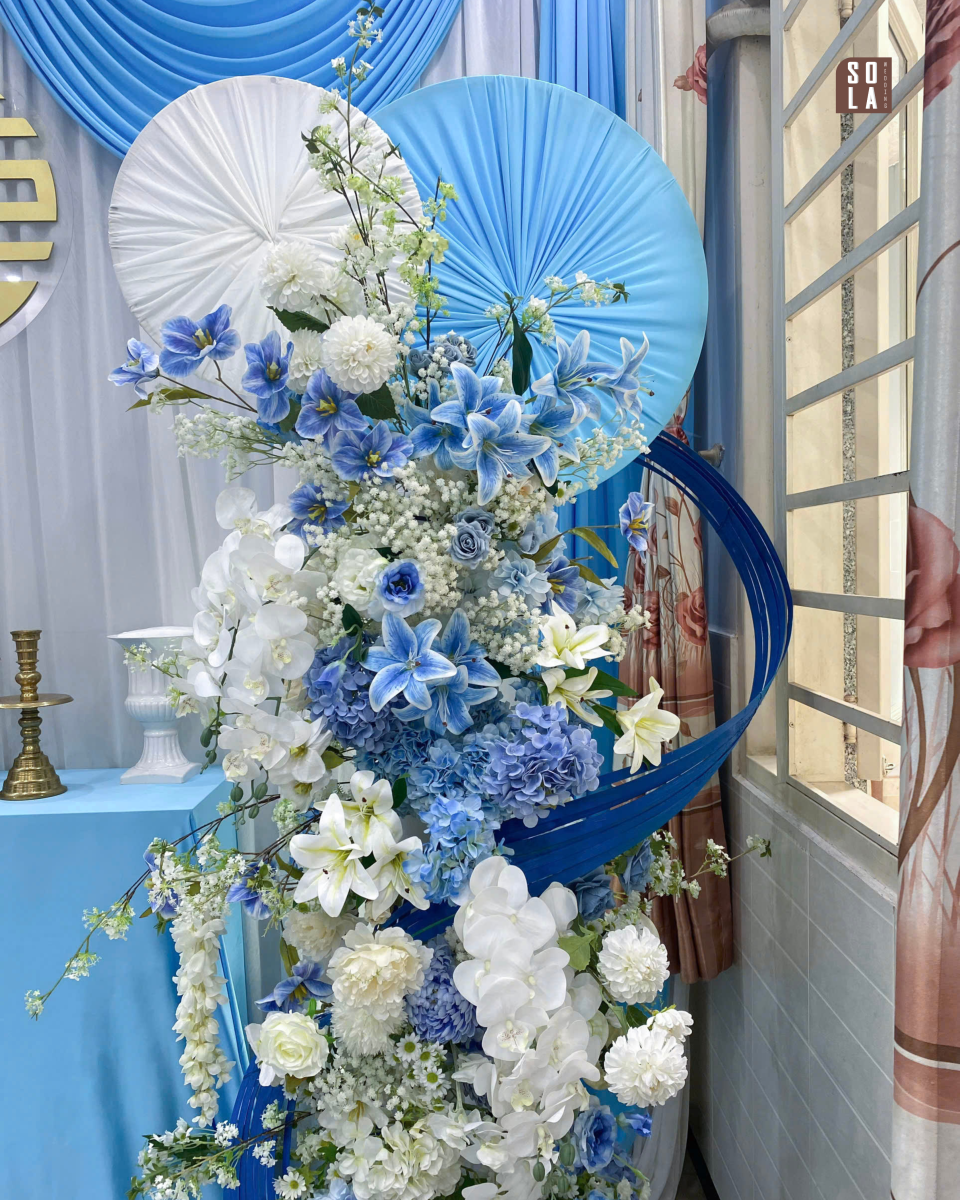 Hoa trang trí gia tiên tông màu xanh thường là hoa cẩm tú cầu, hoa baby, hoặc hồng xanh. Các lẵng hoa được bố trí hài hòa trên bàn thờ, bàn tiệc và lối đi, tạo cảm giác tràn đầy sức sống.