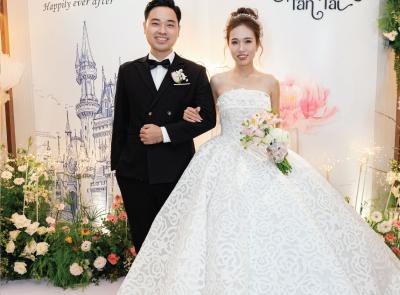 Lấy cảm hứng từ hình ảnh quyển sách cổ tích, backdrop cưới được thiết kế như một trang sách mở ra với hình ảnh tòa lâu đài và dòng chữ "Welcome to our happily ever after" nổi bật giữa sắc trắng dịu dàng. Mỗi chi tiết nhỏ đều góp phần đưa người xem bước vào không gian đầy sự cổ tích, đầy sự nhẹ nhàng, lãng mạn và đong đầy mộng mơ.