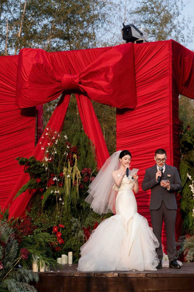 Điểm nhấn ấn tượng nhất của buổi lễ là background nơ đỏ khổng lồ – biểu tượng cho “món quà tình yêu” mà cô dâu – chú rể dành cho nhau.
