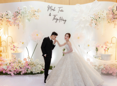 Điểm nhấn của mẫu trang trí backdrop đám cưới này nằm ở phông nền trắng tối giản, kết hợp cùng nghệ thuật cắm hoa bất đối xứng và ánh sáng dịu nhẹ, giúp không gian trở nên tinh tế nhưng vẫn nổi bật. Từng chi tiết trong trang trí lễ cưới đều được chăm chút kỹ lưỡng để mang đến cảm giác bay bổng, hiện đại và đậm dấu ấn cá nhân.