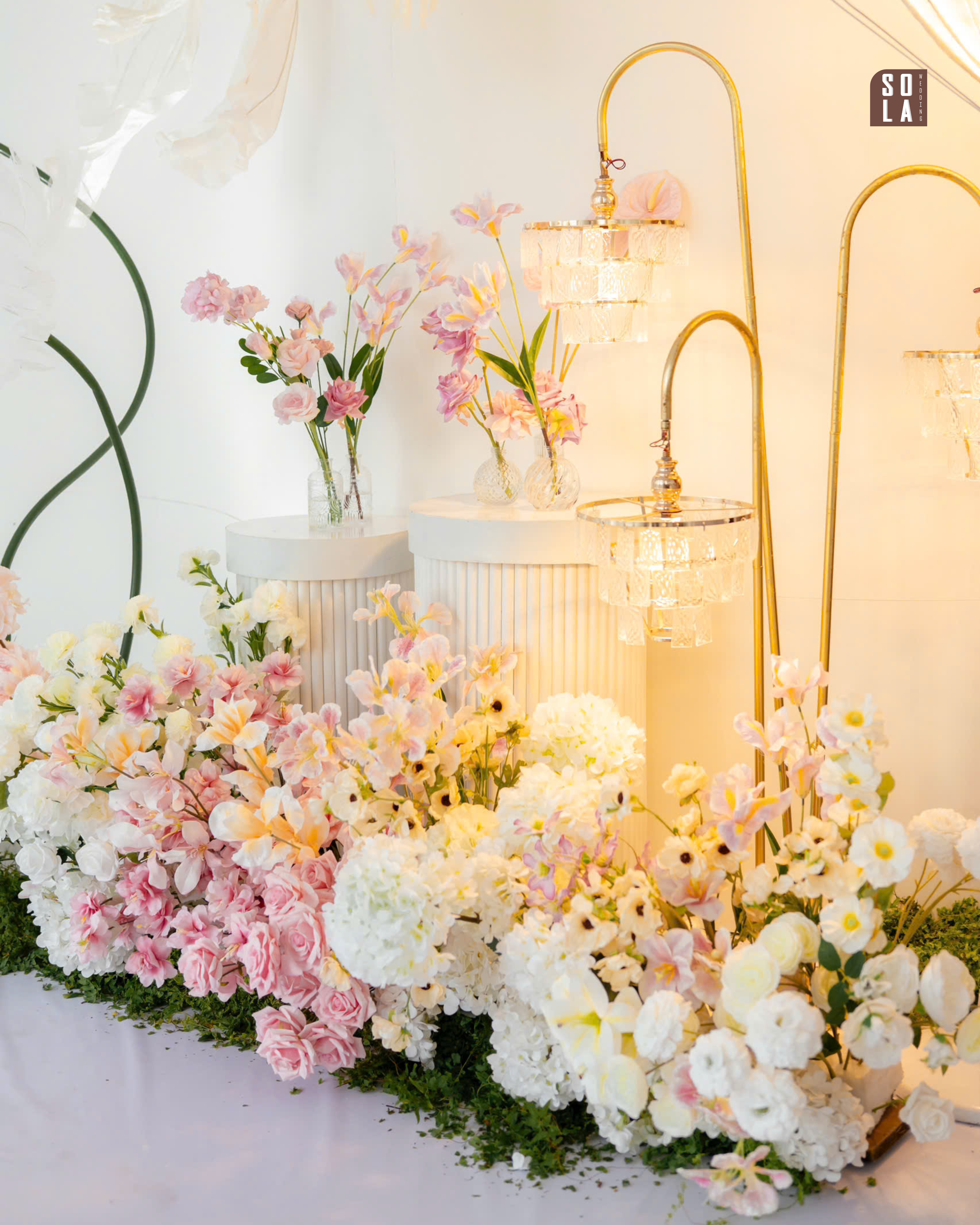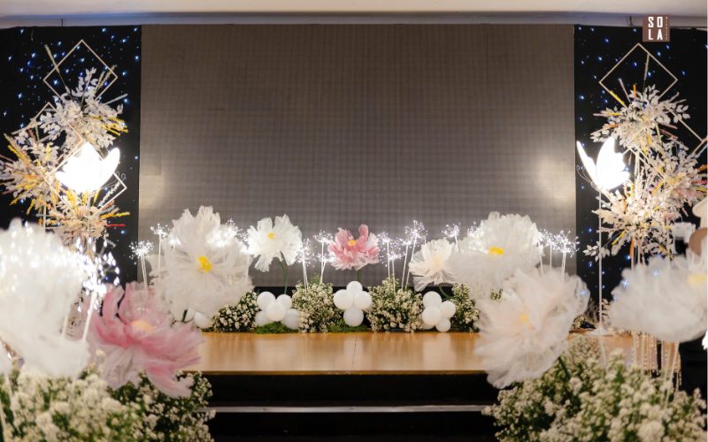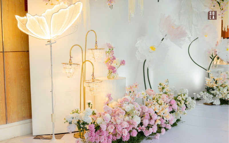 Một không gian trang trí tiệc cưới được Sola Wedding thực hiện với tinh thần nhẹ nhàng, thanh lịch và đầy chất thơ. Concept sử dụng gam màu trắng phối hồng pastel làm chủ đạo, kết hợp cùng hoa tươi bố trí mềm mại, tạo nên tổng thể vừa sang trọng vừa lãng mạn cho ngày trọng đại của cô dâu chú rể.