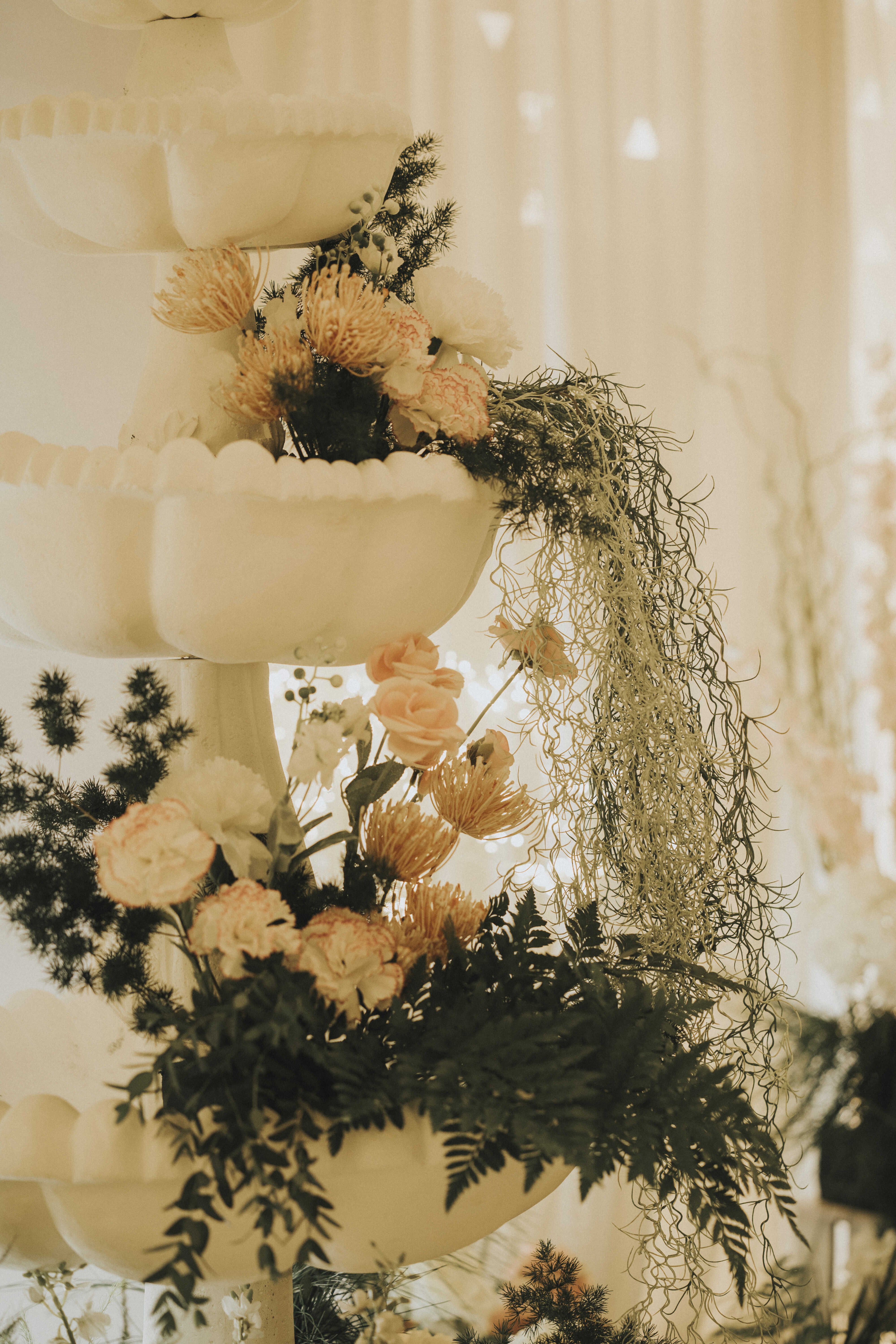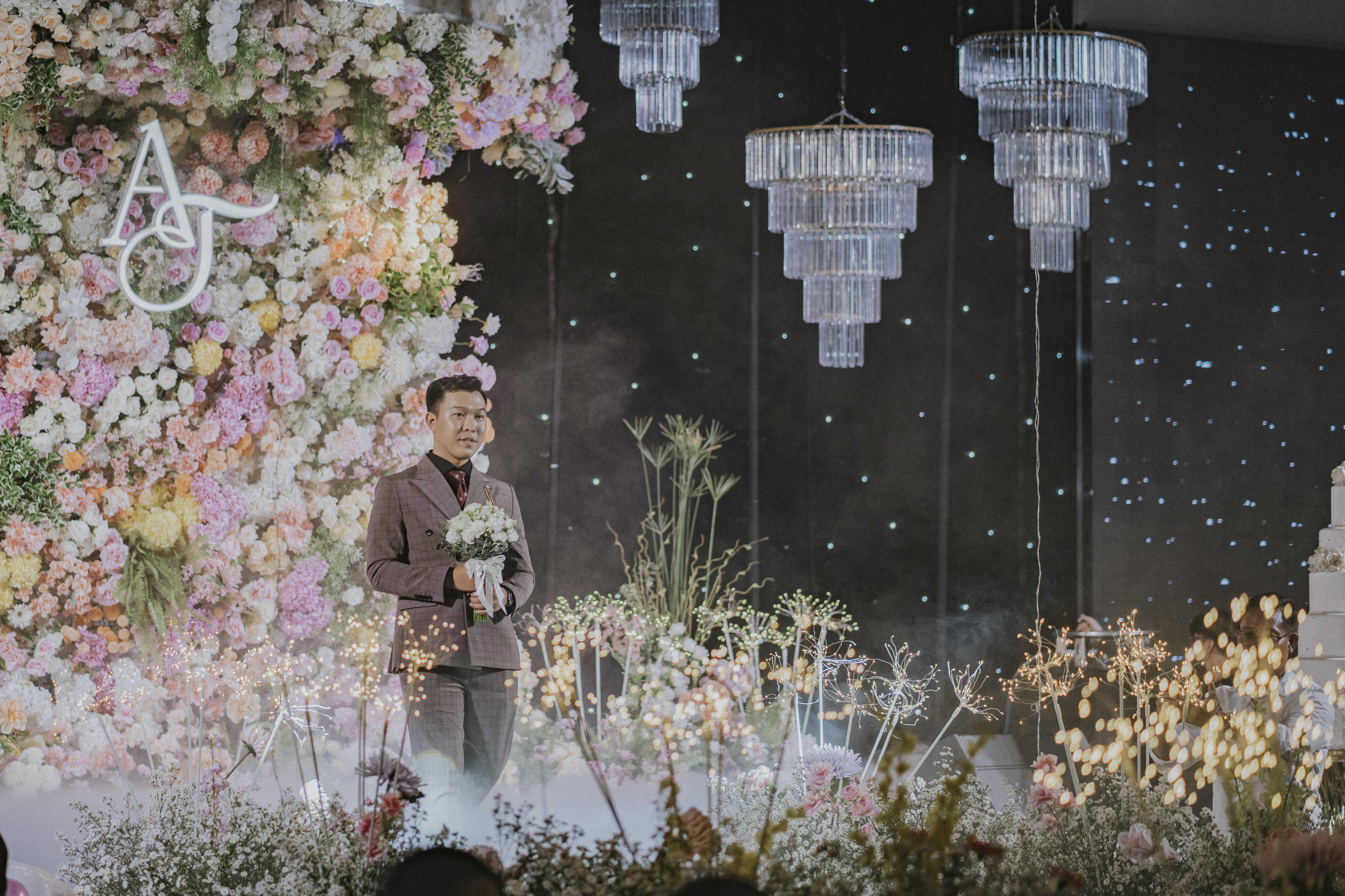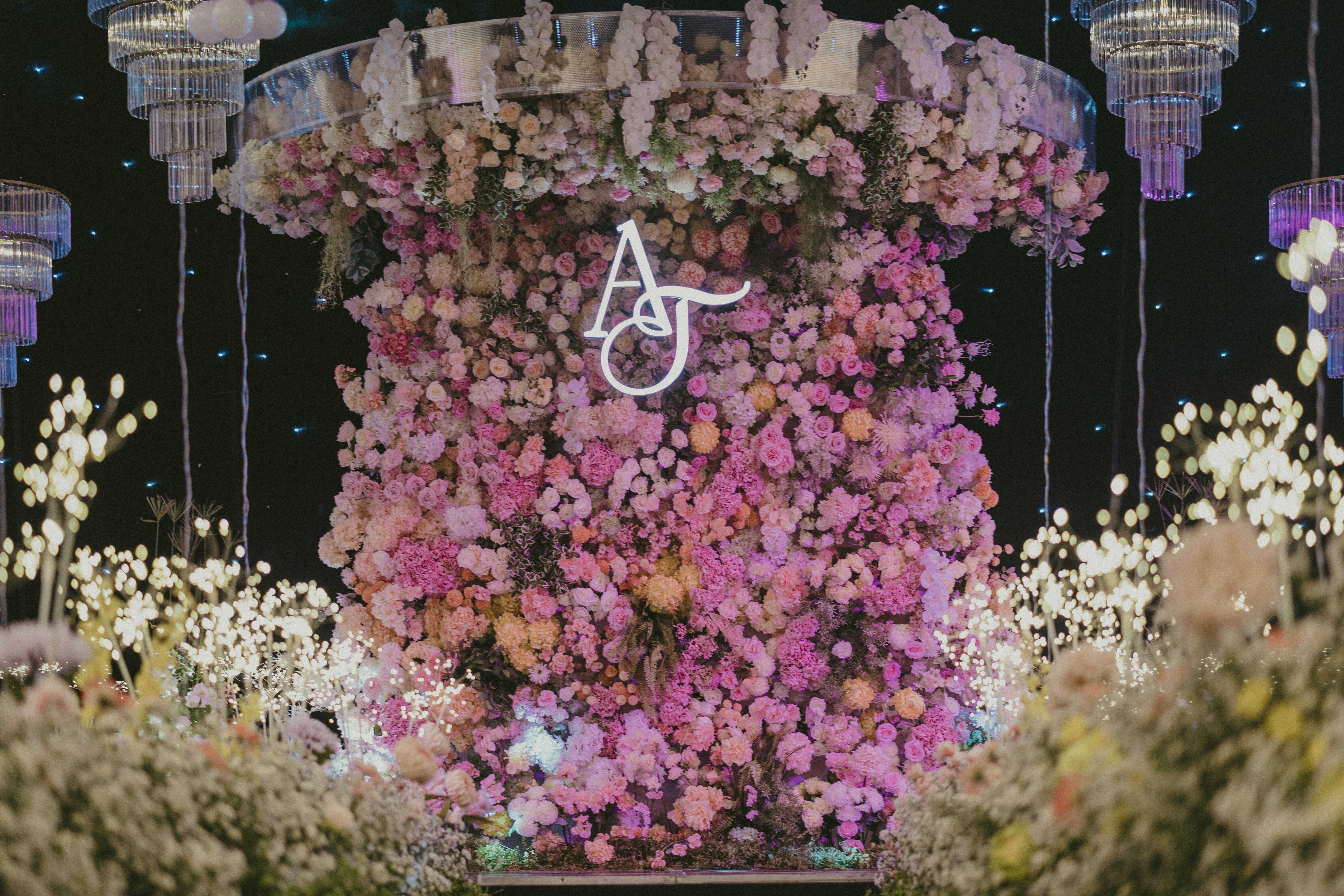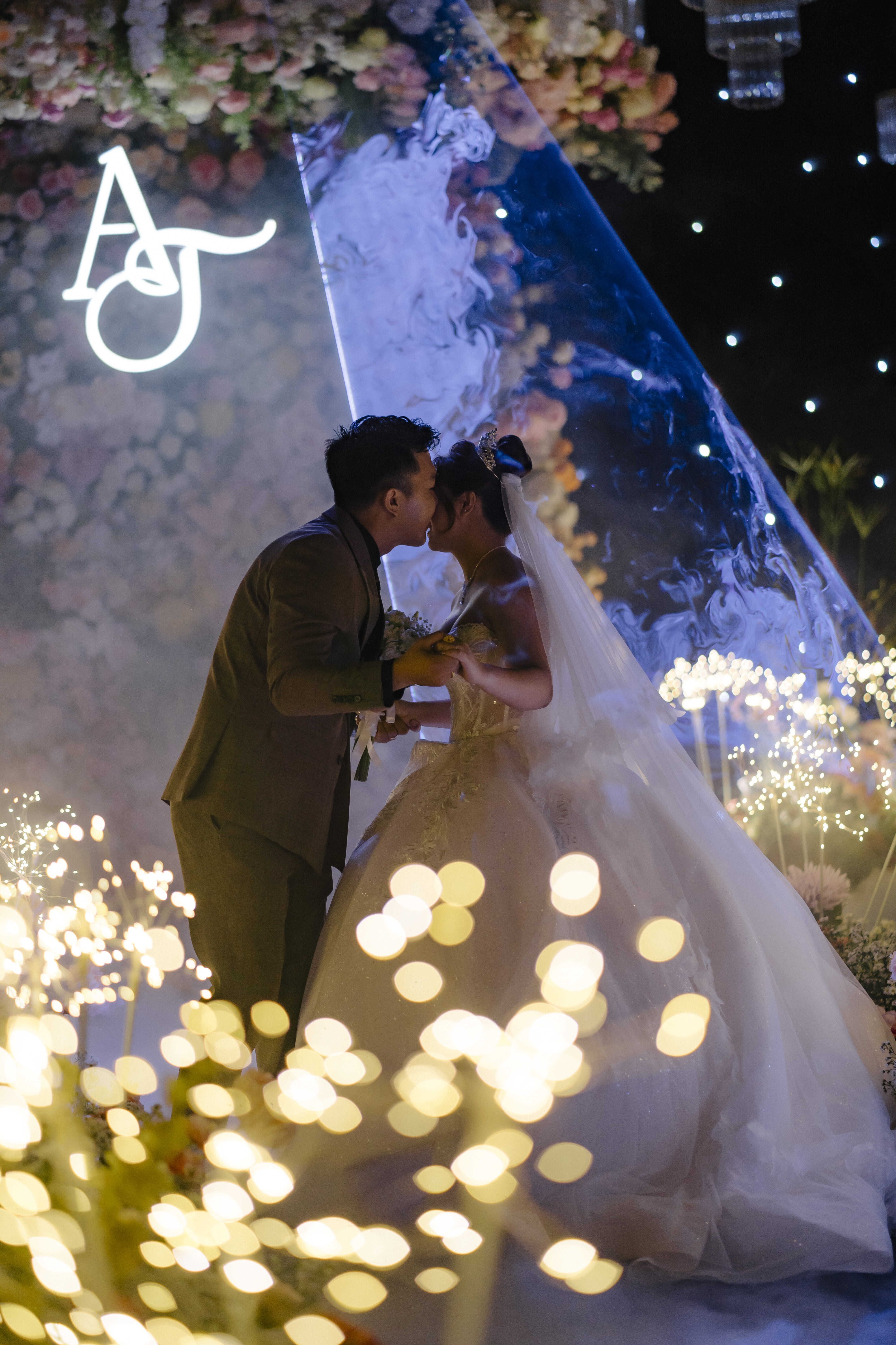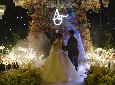 Không gian tiệc như biến thành một bức tranh hoa sống động, nơi mỗi chi tiết – từ gam màu, ánh sáng đến bố cục – đều được Sola tính toán kỹ lưỡng để tôn vinh khoảnh khắc đôi uyên ương chính thức bước vào hành trình mới.