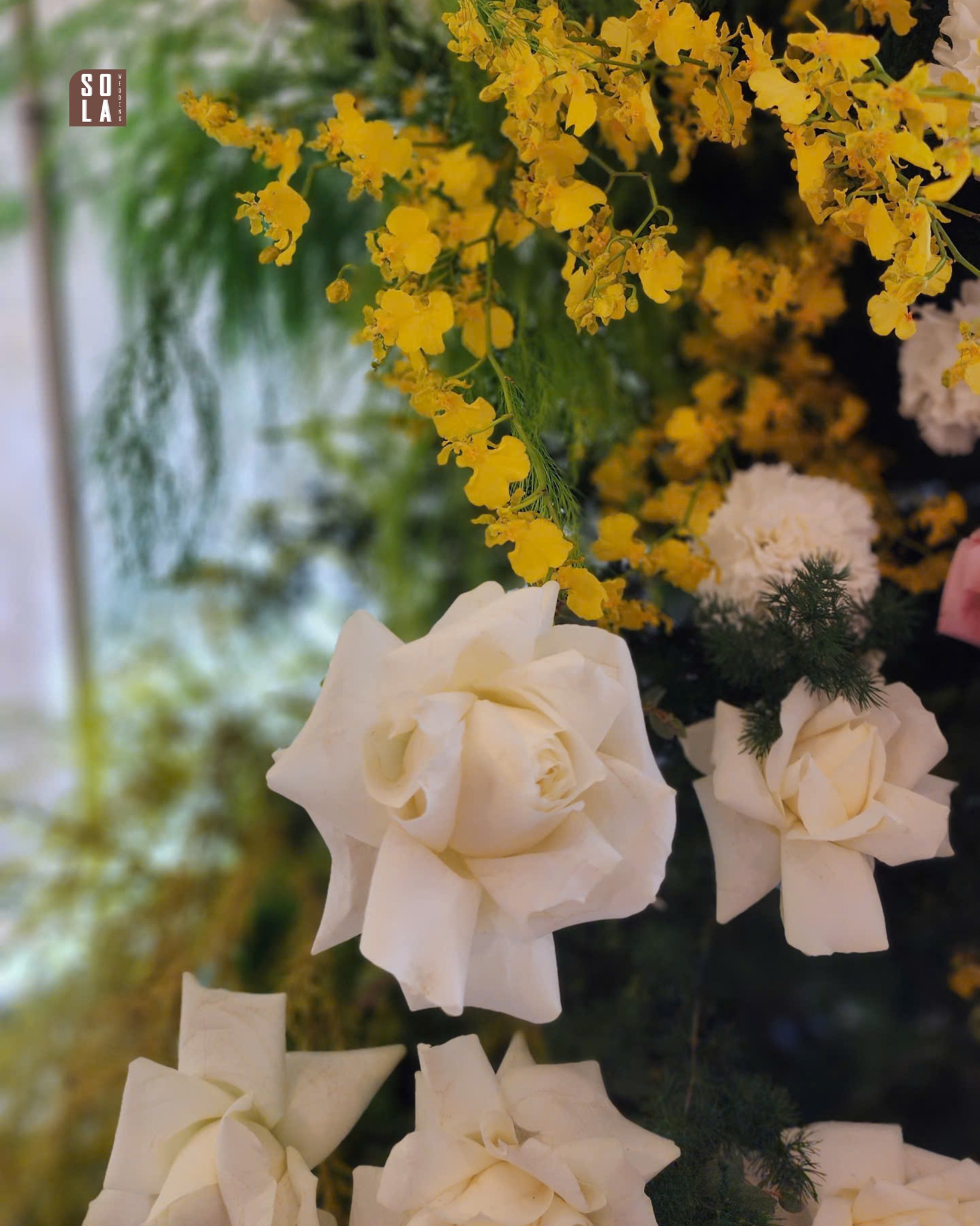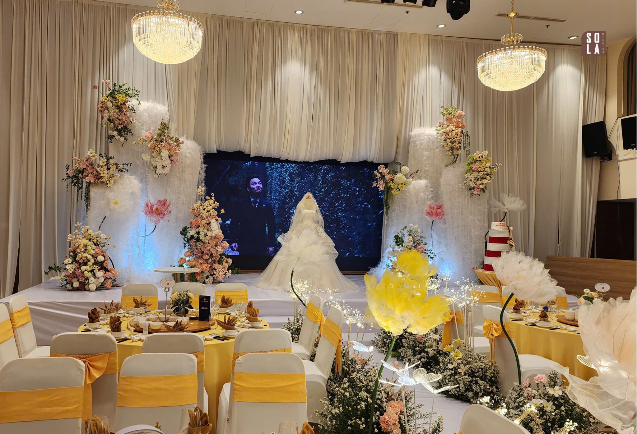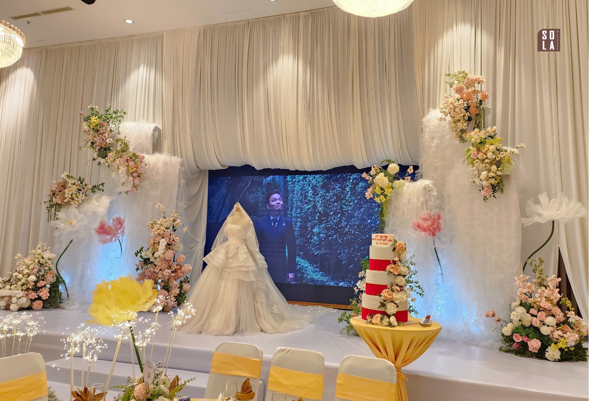 Không gian tiệc cưới được Sola thiết kế như một khu vườn hoa nhẹ nhàng và tinh khôi. Tông trắng – vàng pastel kết hợp cùng những cụm hoa baby, hoa hồng và các chi tiết hoa nghệ thuật tạo nên lối đi lãng mạn dẫn đến sân khấu. Mỗi góc nhỏ đều được chăm chút tỉ mỉ để mang lại cảm giác mềm mại, sang trọng nhưng vẫn rất tự nhiên.