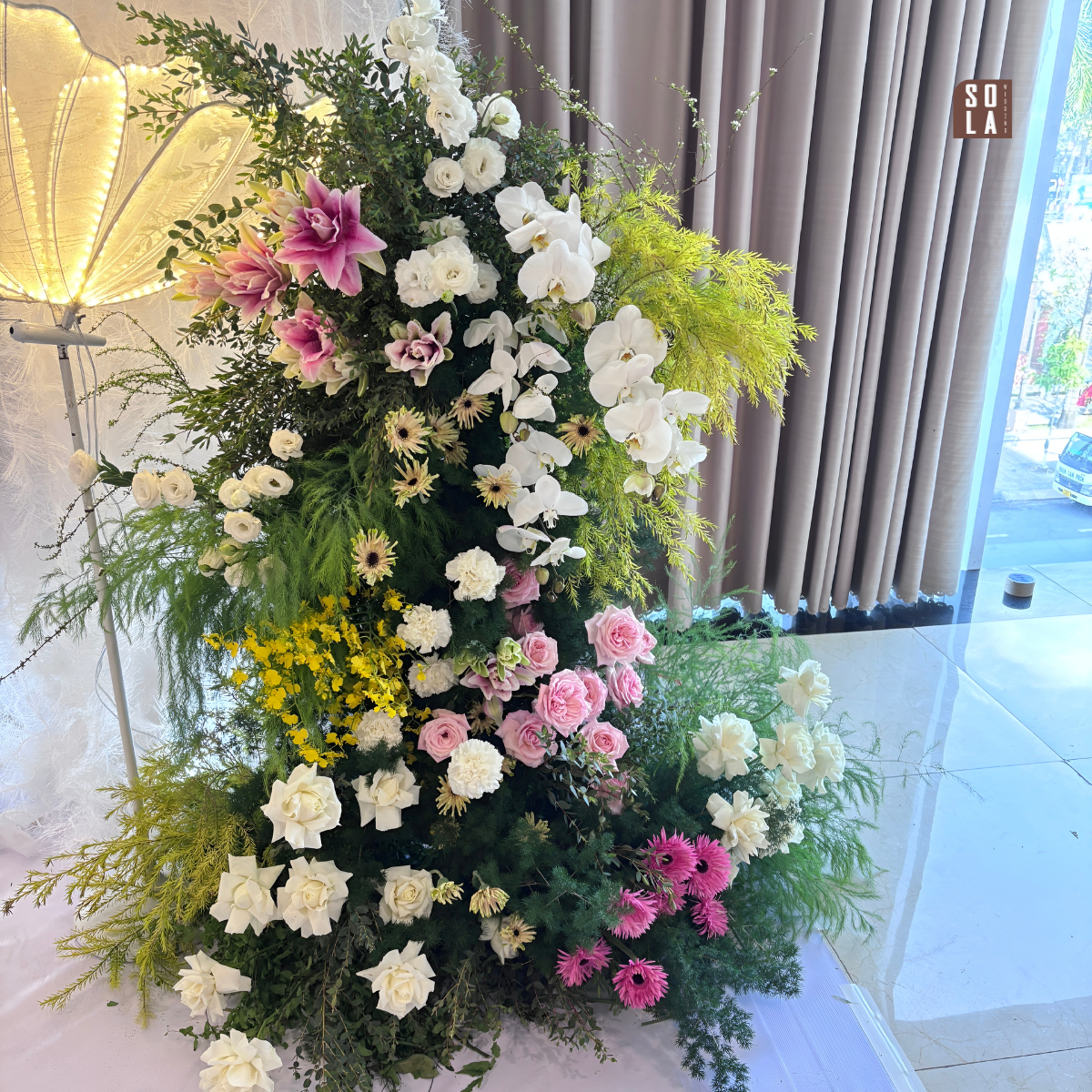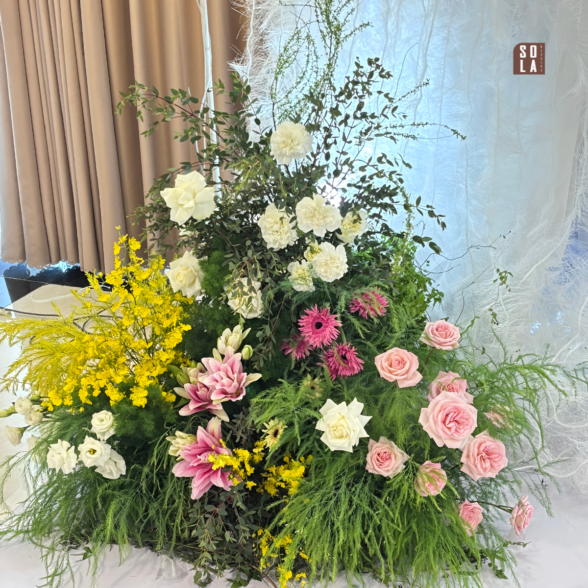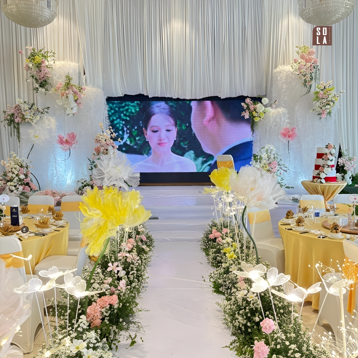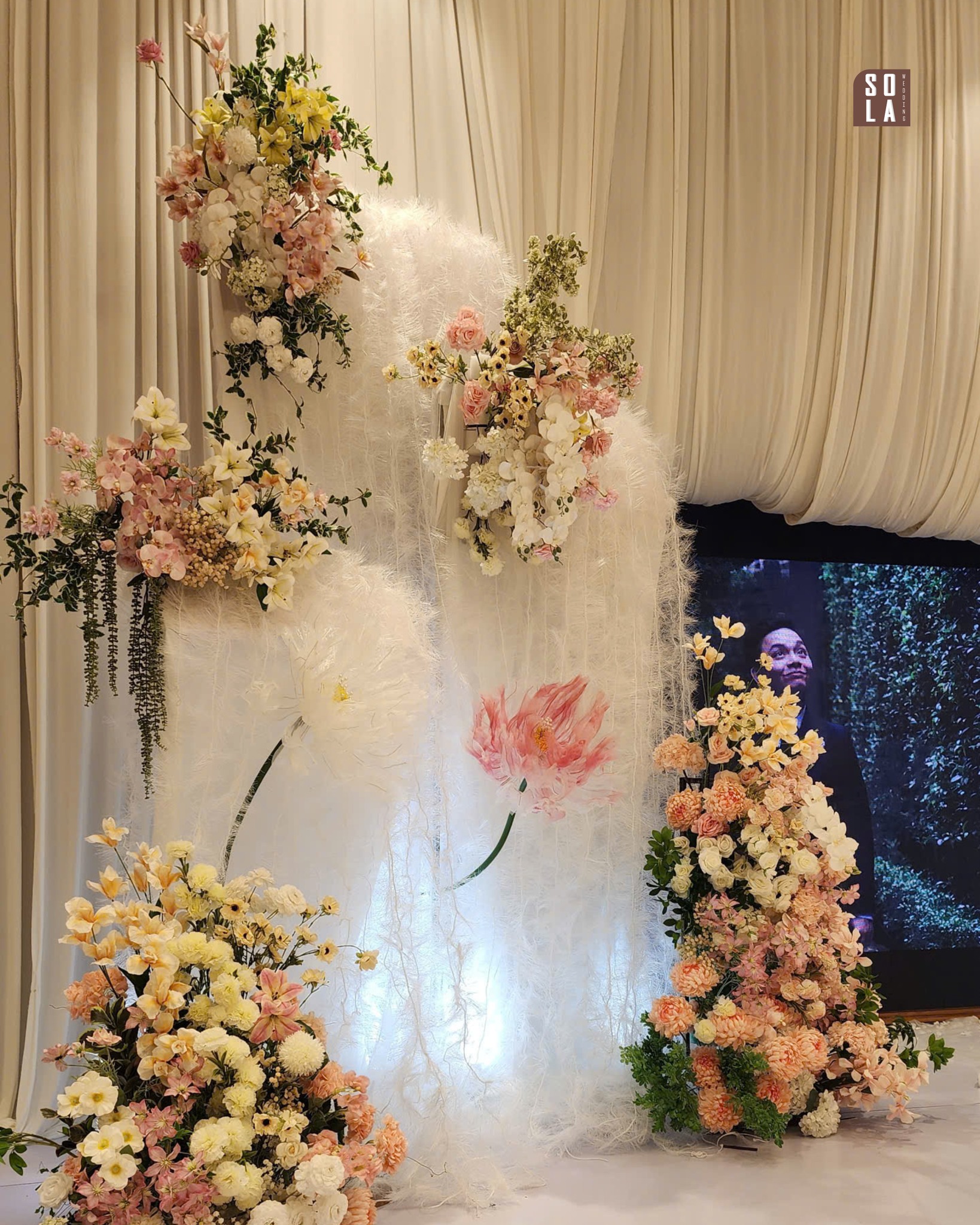 Không gian tiệc cưới được Sola thiết kế như một khu vườn hoa nhẹ nhàng và tinh khôi. Tông trắng – vàng pastel kết hợp cùng những cụm hoa baby, hoa hồng và các chi tiết hoa nghệ thuật tạo nên lối đi lãng mạn dẫn đến sân khấu. Mỗi góc nhỏ đều được chăm chút tỉ mỉ để mang lại cảm giác mềm mại, sang trọng nhưng vẫn rất tự nhiên.